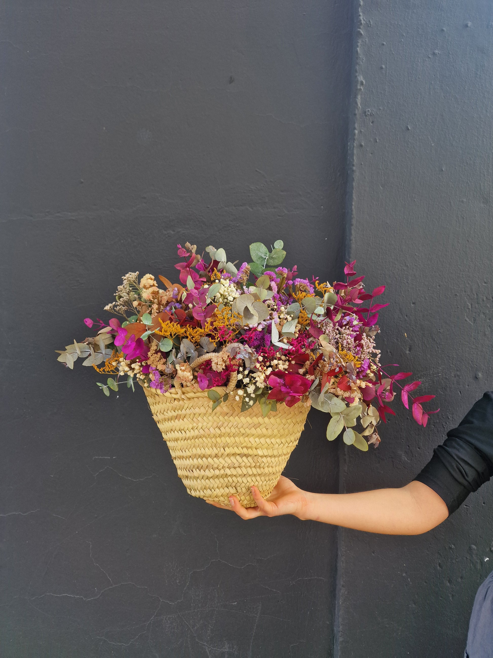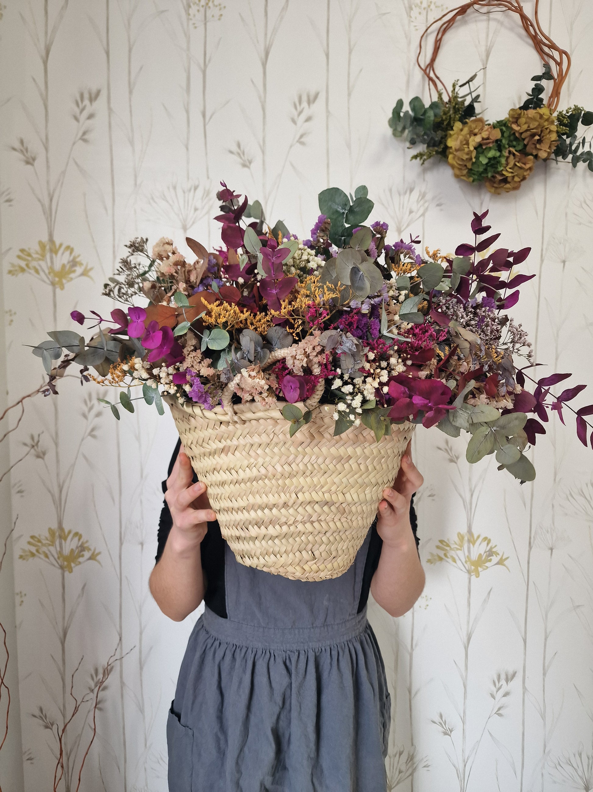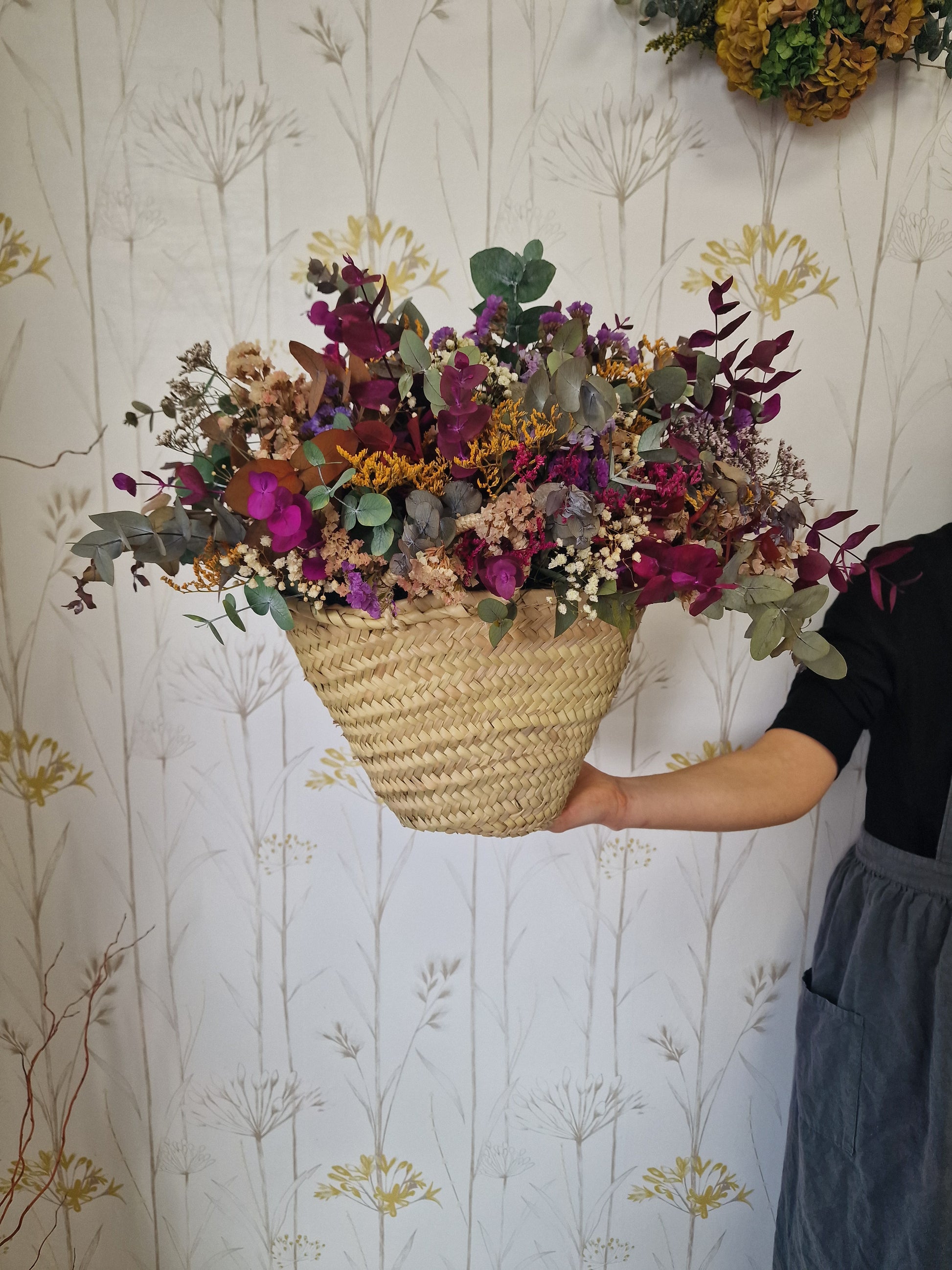 Esta cesta contiene eucalipto preservado en distintos tonos, statice, paniculata y limonium, todas ellas flores preservadas, que mantienen su aspecto y color sin necesidad de agua ni cuidados.