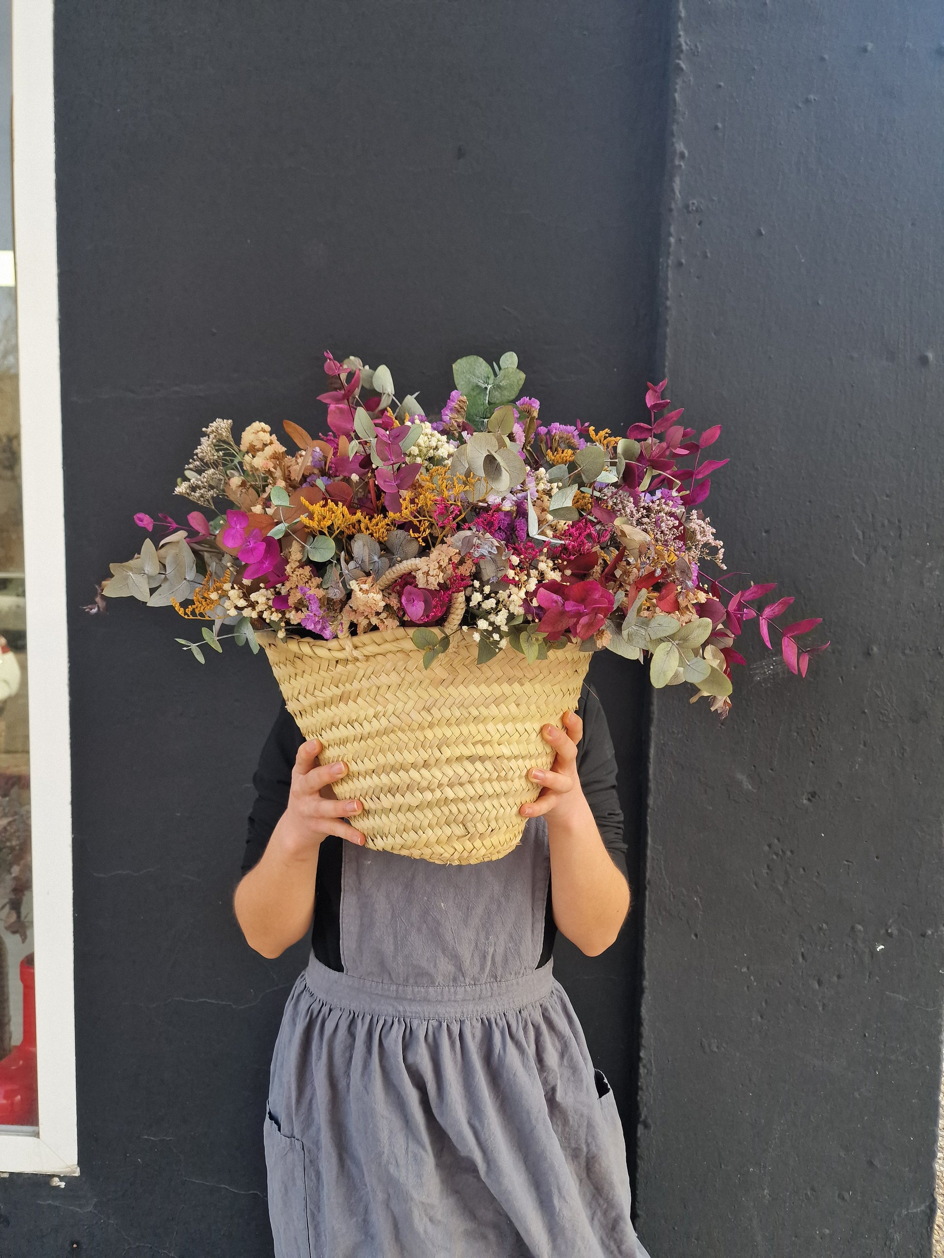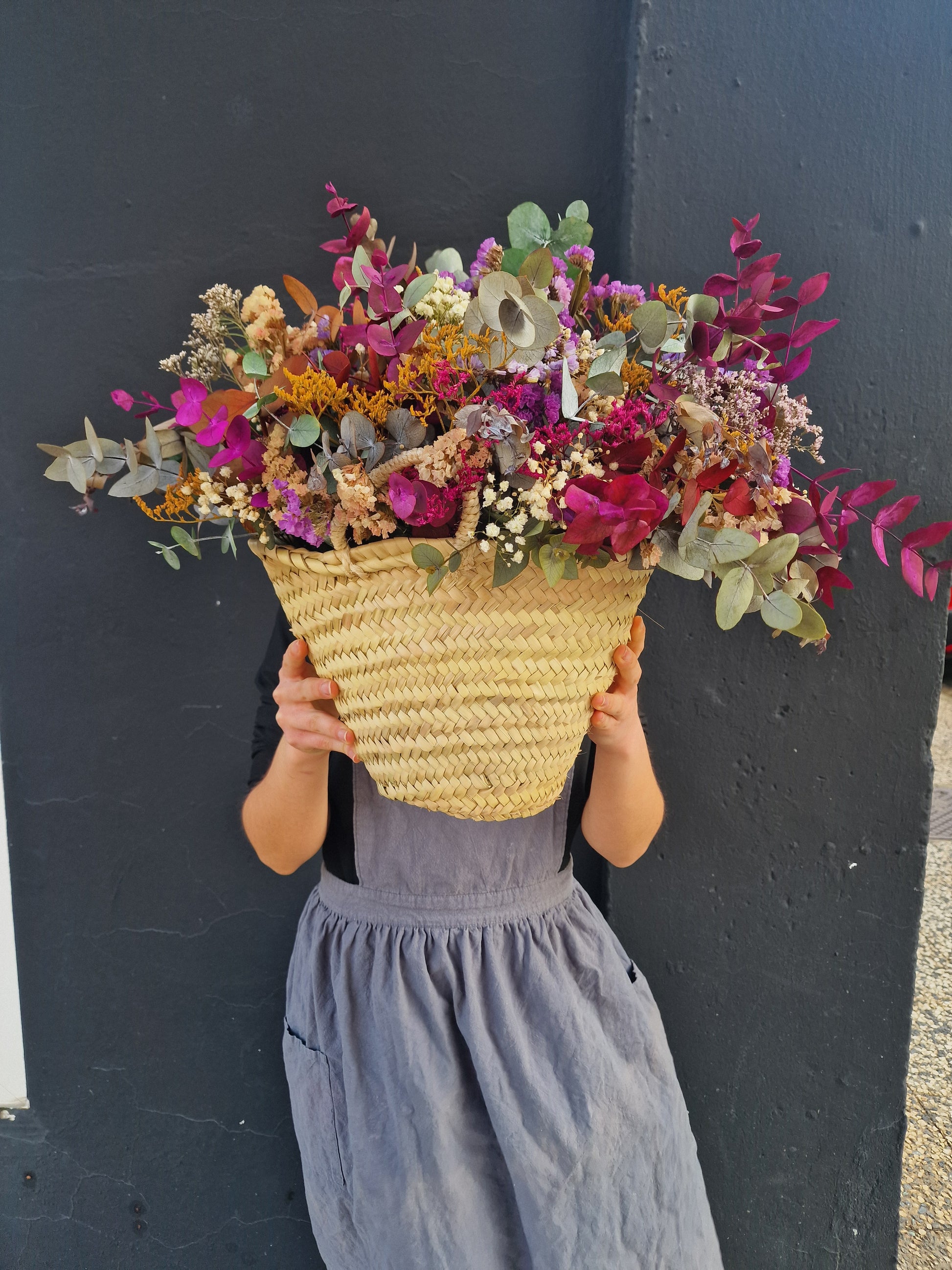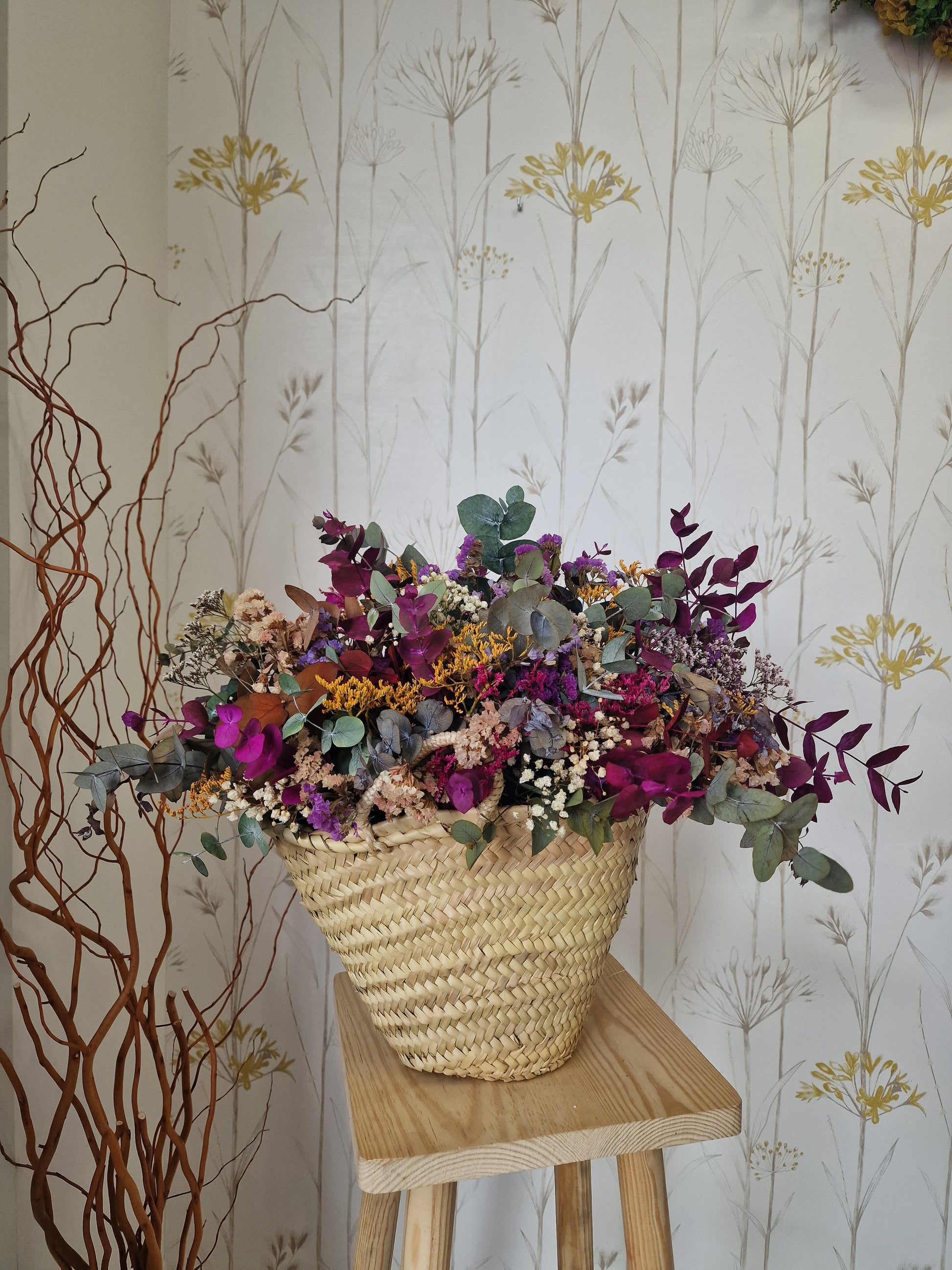 Esta cesta contiene eucalipto preservado en distintos tonos, statice, paniculata y limonium, todas ellas flores preservadas, que mantienen su aspecto y color sin necesidad de agua ni cuidados.